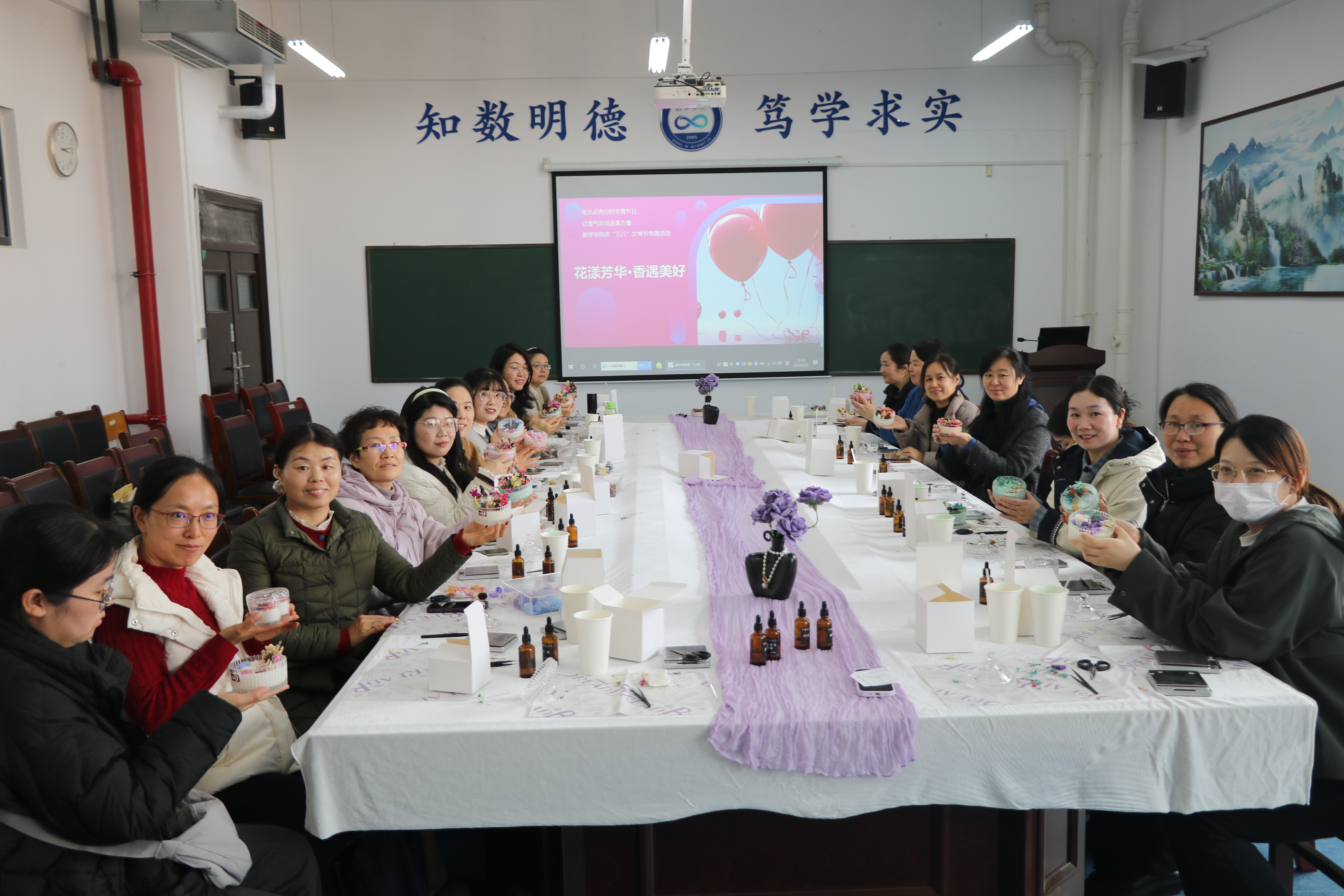为庆祝第116个“三八”国际妇女节,丰富女教职工精神文化生活,数学学院分工会于3月11日下午在06C502举办“花漾芳华·香遇美好”花艺香薰手工制作活动。全院女教职工踊跃参与,以花艺抒怀、以香薰静心,共度温馨雅致的节日时光。