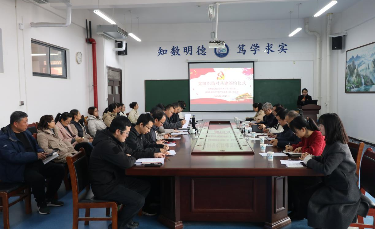 3月19日下午,数学学院教工第一党支部与河南牧业经济学院理学部教工第二党支部结对共建签约仪式在学院会议室06C502举行。双方领导班子及相关负责同志参加活动。